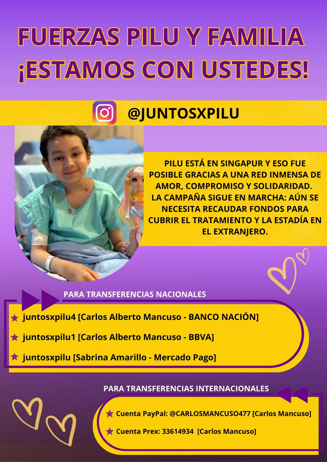 Se pone en su conocimiento la campaña solidaria de la familia de la niña argentina Pilu Yanina Mancuso, quien se encuentra en Singapur para acceder a un tratamiento médico indispensable para ella...